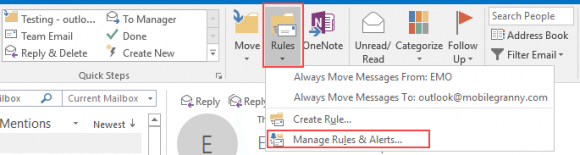 - Open the Manage Rules & Alerts wizard. In Outlook 2010 and above, it's on the Home tab, to the right of Quick Steps