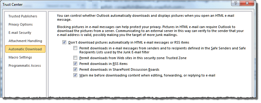 When you select Change Automatic Download Settings, the Trust Center dialog opens to the Download Settings page: