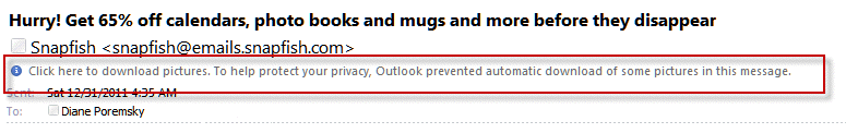 Outlook protects your privacy by blocking the download of external content ("web bugs") by default. You can easily change this setting if you prefer to download everything at once.