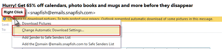 If you want to change your settings to always download blocked content, you can access the settings one of two ways: the long way is through File, Options, Trust Center (Outlook 2010), Tools, Trust Center (Outlook 2007). Or use the shortcut: right click on the text in the Infobar in the message header, just under the subject and sender: