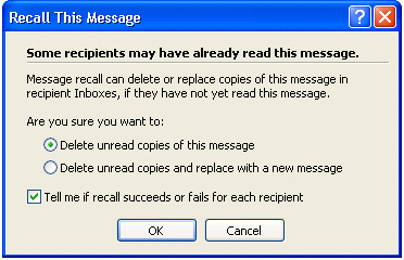 After clicking Recall this Message, the Recall dialog comes up, giving you the option of Deleting the message (if unread) or replacing the message with a new one.