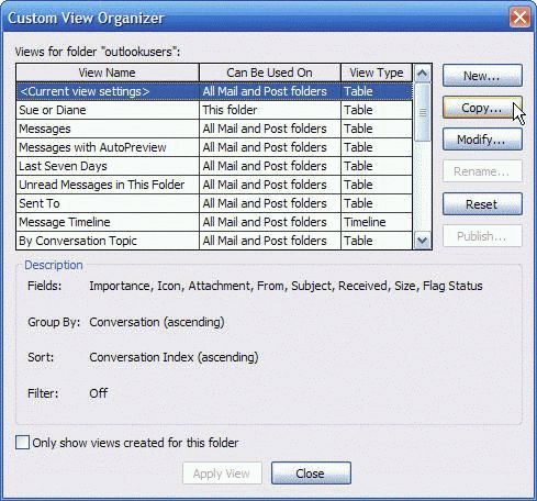 Select a view, then click the Modify button to make changes. Use this dialog to copy or delete views.