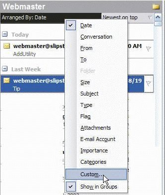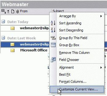 The first menu is seen when you use Outlook 2003's new message list with the two line view and right click on any of the field names across the top. The second is what you'll see in Outlook 2003 with one line (slide the reading pane to the right to make it smaller or close the reading pane) or if using older versions of Outlook.