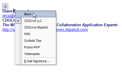 If you don't want to use a signature with an account, create one called Blank. Enter two dashes and a space (– ) then Enter to create a signature that is identifiable. While you could just enter a space or two, it makes it easier to locate the signature block when it's marked with the standard signature delimiter of –. This makes it easier when you right click to swap signatures or if you are having problems with spell check seemingly not working correctly (Outlook signatures and spell check).