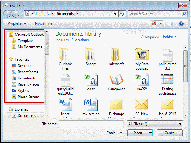 A user discovered the Recent Documents link is missing from the Insert File dialog: