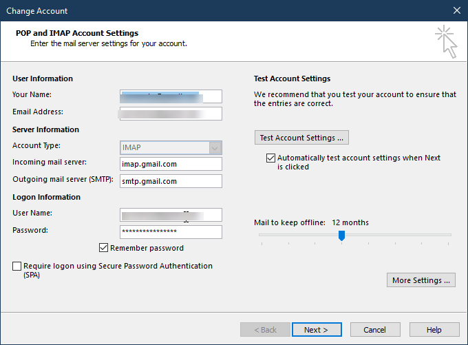 With Outlook’s new simplified Account Setting dialog, users have discovered the password field and server settings are no longer accessible through the File, Account Settings dialog. While Outlook will ask you to enter the password on the next send and receive, you can use the Reset Mail Settings button in the bottom left of the dialog to reset the account. If you want to check the server and port settings too, you can access the full account settings dialog one of two ways.
