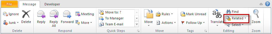 In an opened message, the Related command is on the right side of the ribbon, in the Editing chunk.
