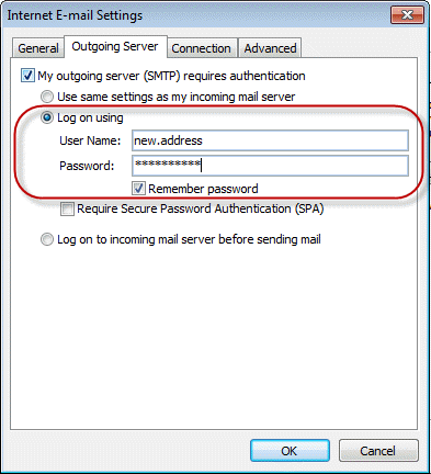 On the Outgoing Server tab, enter the authentication for the SMTP server you are using. You may also need to configure port numbers and SSL settings on the Advanced tab.