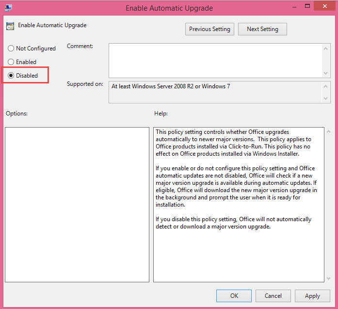 Double click on Enable Automatic Upgrade and choose Disabled, then click Apply and close the dialog. If Outlook is open, close and restart it.