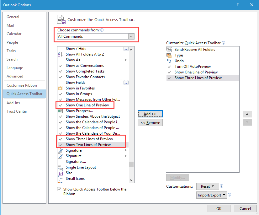 One client added the 1 and 3 line commands to the Quick Access Toolbar (QAT) so he could quickly switch between views. He has the QAT below the ribbon and the 1 and 3 line commands are right above the message list, which makes them easy to use.