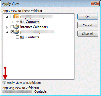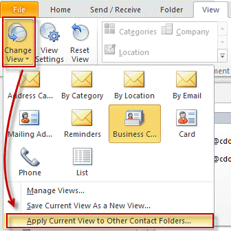 A user had a view he liked in his older version of Outlook but Outlook 2010 messed it up. Provided he has a backup pst that contains the contacts formatted with the view, he can apply the view to other contact folders.
