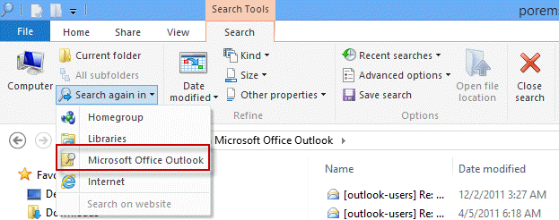 In this screenshot, Search found 1 email message only because it was saved in My Documents.