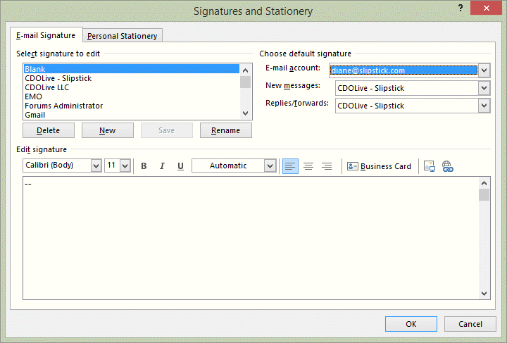 So… always assign a signature to all of your email accounts. If you don’t want a signature on an account, create a blank signature that contains just two dashes ( — ) so you can see where the signature begins.