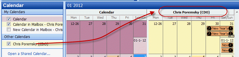 When you open the Calendar using the Open a Shared Calendar link, you'll see just the person's name.