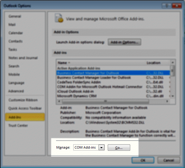 In Outlook 2007, look in Tools, Trust Center, Add-ins and in Outlook 2010 and Outlook 2013, try File, Options, Trust Center, Add-ins. At the bottom of the dialog is a menu for Manage: COM Add-ins. Click the Go button and deselect the Toshiba add-in.