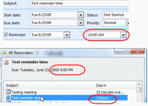 Now, the reminder window shows the tasks due at the end of the workday (set in Tools, Options, Calendar options) so the same task that was overdue at 11 AM is now due in 2 hours.
