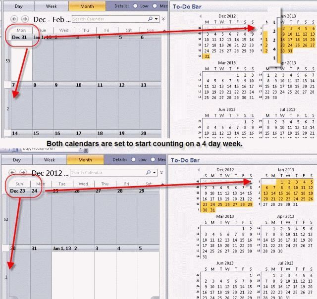 "How does Outlook calculate the week numbers? In my part of the world, the first day of the week is Monday. Now if I look at the Outlook calendar and browse towards January 2013 I see something strange: The week from 31 Dec. 2012 to 06 January 2013 has week number 53. The following week however has week number 2. So where is week number 1 of the year 2013?"
