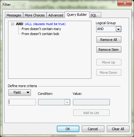 and since everything except Mary's message are not from Mary, and everything, including Mary's messages, are not from Bob (except Bob's messages), the condition is always going to be TRUE. Outlook is processing the rules as "(if not Mary) OR (if not Bob)", not "if not (Mary or Bob)".