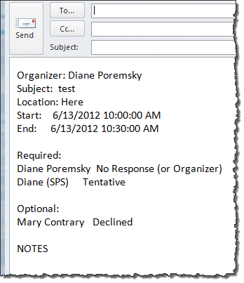 The VBA to send the meeting details and responses to a Word document is on Outlookcode.com but because many users complain that it doesn't work, I tweaked the code to print the list to a new Outlook message.